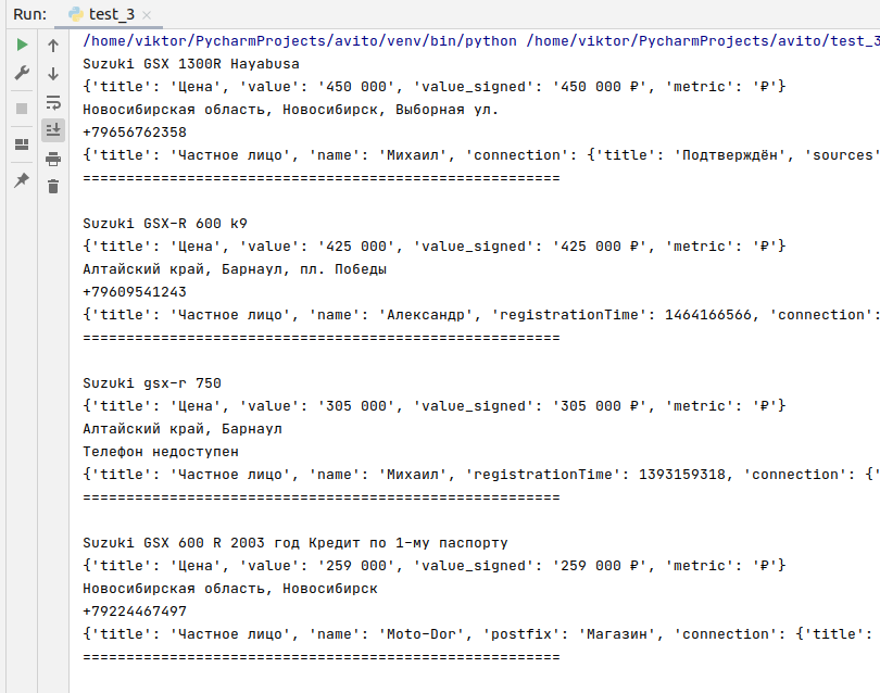 Я не буду детально разбирать свой скрипт, в коде достаточно комментариев, чтоб понять что и на каком этапе происходит. Если кратко, то используется мобильная версия сайта, объявляются переменные для поиска по сайту, а так-же две переменные «key» и «cookie», о них далее подробнее, потом идет процесс получения куки путем открытия главной страницы, далее запускается цикл, которые собирает id всех объявлений проходя по всем страницам. После того, как получены все объявления вторым циклом проходим по ним и получаем интересующую нас информацию.