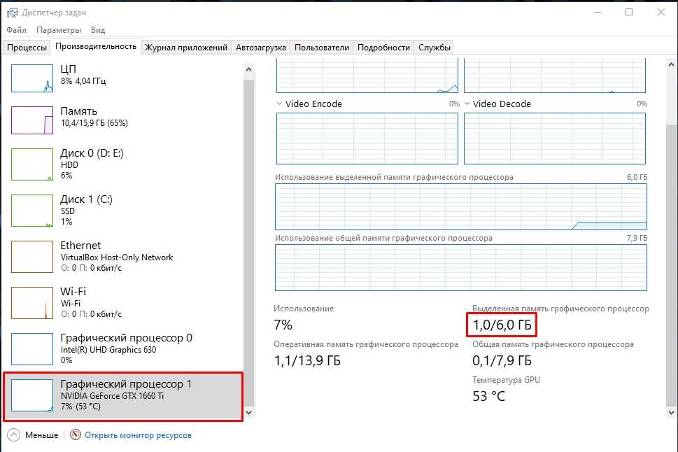 - Если ваш компьютер оснащен двумя графическими процессорами, выберите GPU 1, чтобы просмотреть использование памяти выделенной видеокарты VRAM.