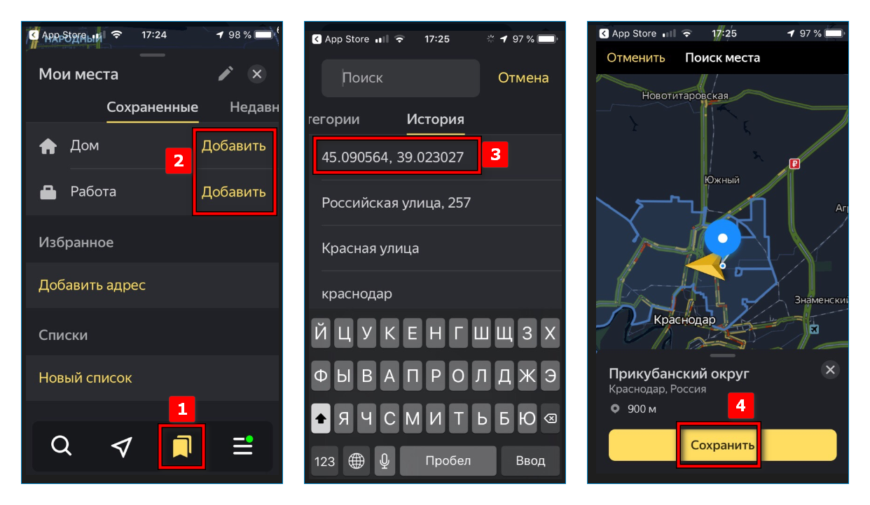 Сейчас попробую показать процесс на примере сохранения точки для смартфона и приложения яндекс-навигатора