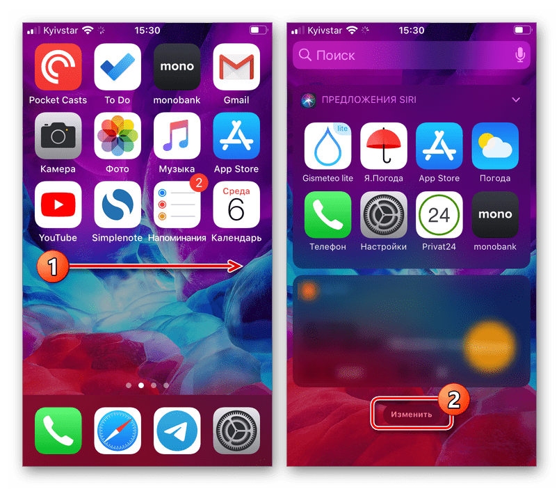 - При использовании устройств на базе iOS 13 и ниже виджеты могут быть добавлены на специальный экран. Чтобы выполнить данную задачу, на первом экране «Домой» воспользуйтесь свайпом вправо, пролистайте страницу до самого низа и нажмите кнопку «Изменить».