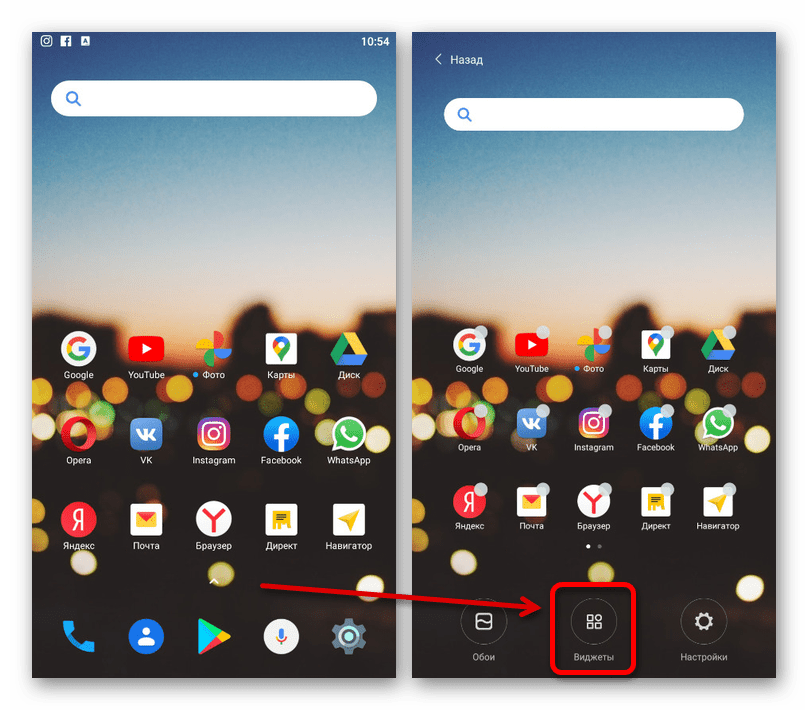 - Переходим в раздел со всеми виджетами на устройстве. Для этого совершаем длительное нажатие по любой точке рабочего стола. В итоге на экране должно появиться дополнительное меню.