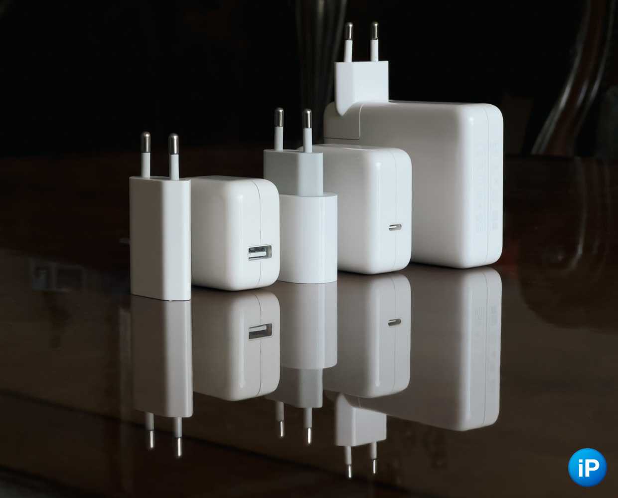 Слева направо: iPhone 11, адаптер на 5 Вт, 12 Вт, 18 Вт, 30 Вт, 87 Вт