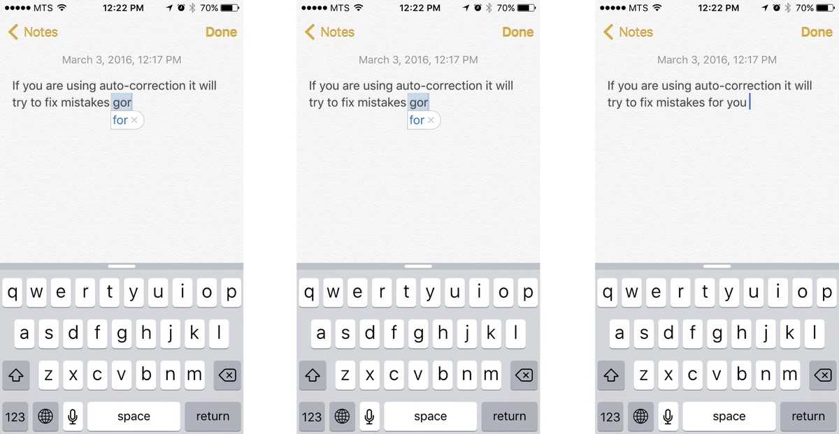 Чудо автокоррекции означает, что вам нужно только продолжить ввод текста— либо нажав Пробел , либо нажав Return , либо добавив знаки препинания— чтобы принять изменение. Но это становится проблемой, когда ваш iPhone начинает исправлять слова, которые вы не хотите, чтобы были изменены
