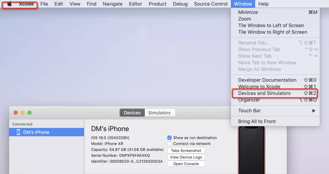 Step 3. In Xcode, navigate to the Window menu and select Devices and Simulators.
