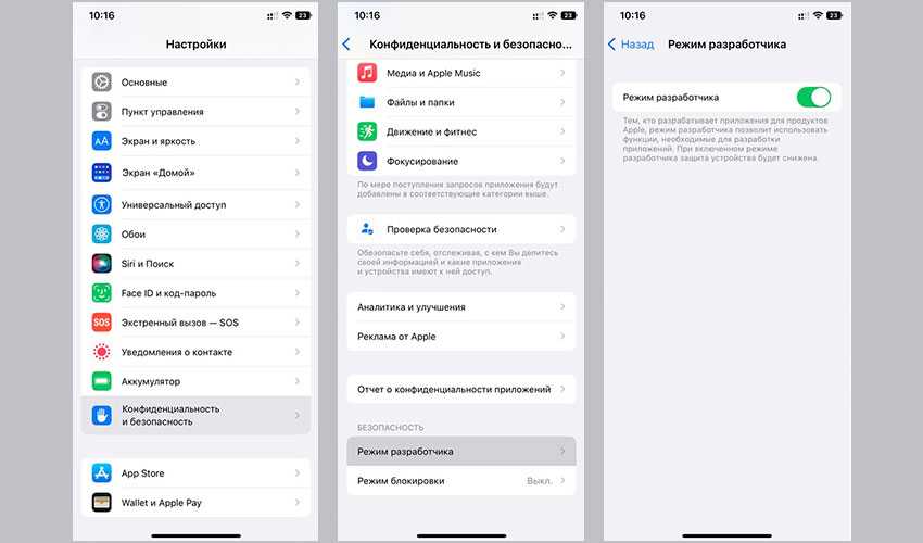 На iOS 16 использование режима разработчика на iPhone для многих пользователей стало необходимостью, так как без активации этого режима установка приложений не через App Store становится проблематичной. Да и многие другие возможности остаются недоступными. Чтобы включить режим разработчика на iPhone, надо выполнить такие шаги:
