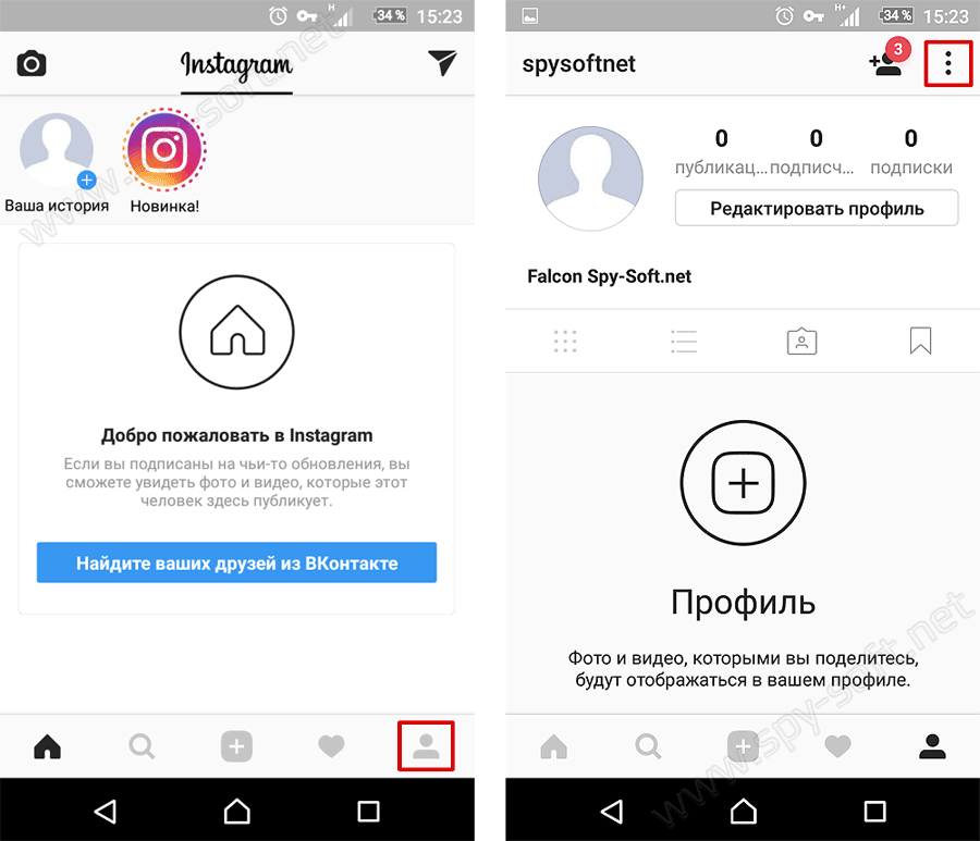 1. Зайдите в приложение Instragram и нажмите в правом нижнем углу на иконку человечка. После чего в окне профиля в правом верхнем углу нажмите на три точки.