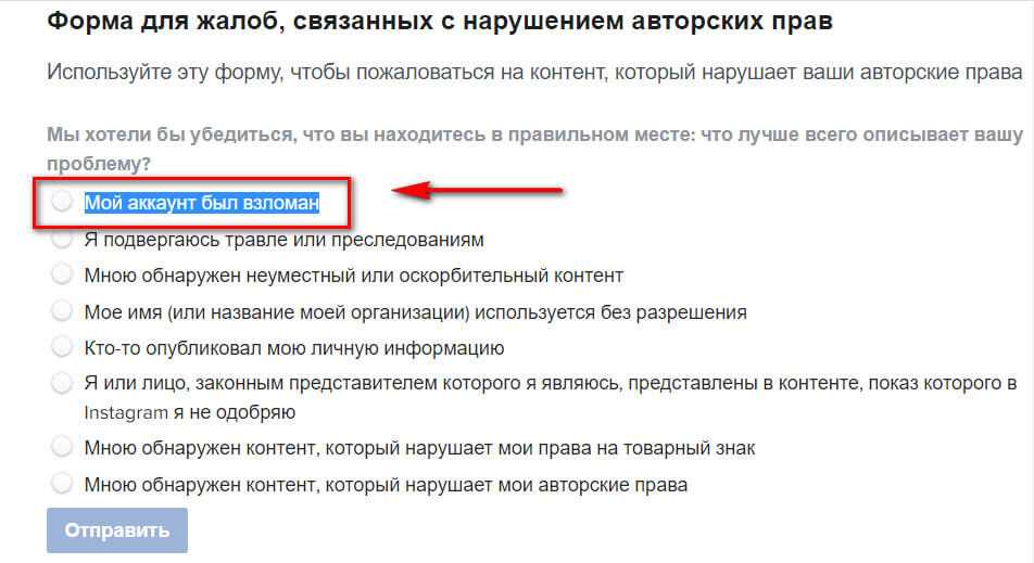Если все безнадежно, и стандартный способ не помогает — обращаемся в саппорт по данной ссылке — это форма жалобы на нарушение авторских прав, нам нужна первая строчка «Мой аккаунт был взломан».