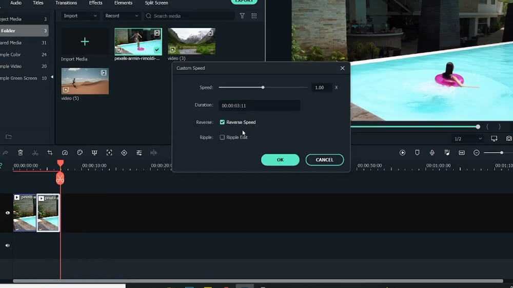 В диалоговом окне «Пользовательская скорость» вы найдете параметры скорости, продолжительности, реверса и пульсации. Чтобы создать видео с циклическими эффектами, щелкните параметр «Обратный», чтобы автоматически перевернуть воспроизведение видео с конца на начальный кадр. Нажмите OK, чтобы сохранить настройки.