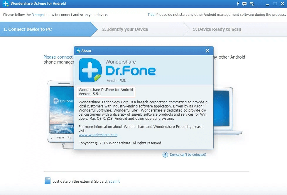 Приложение WonderShare Dr Fone справляется с восстановлением изображений на устройствах Android, тоже требуя всего лишь скачивания, запуска и подключения мобильного устройства к ПК.