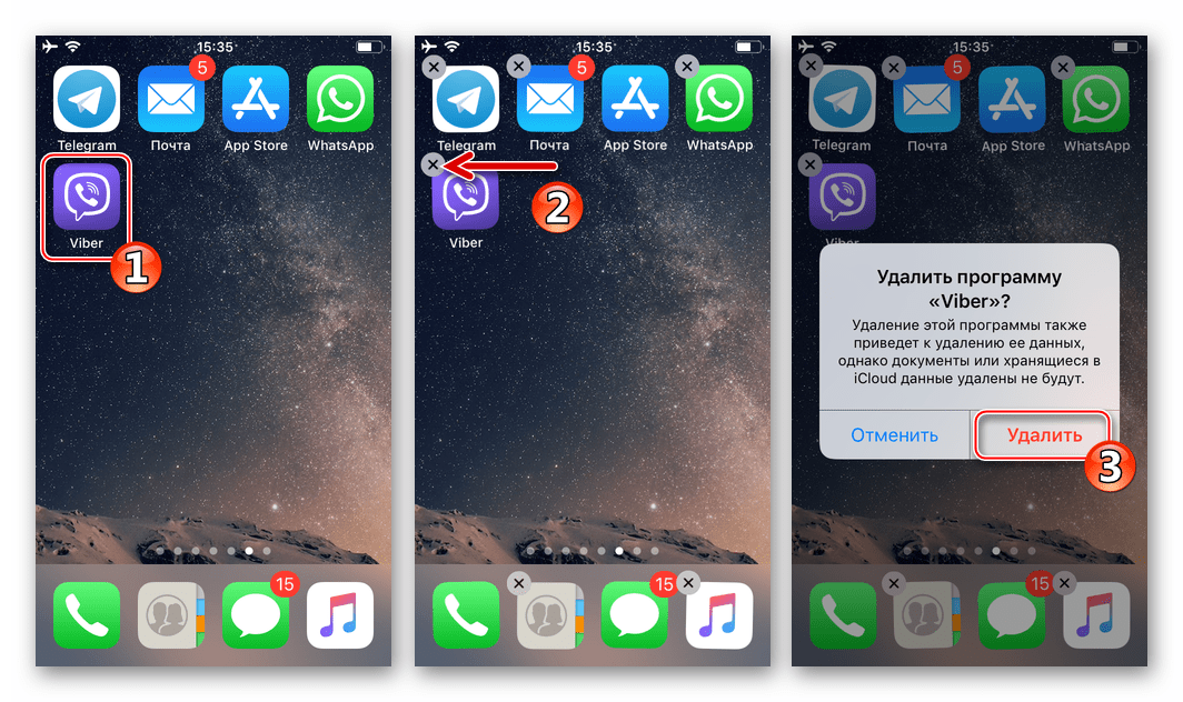 - Удалите iOS-клиент Viber. Проще всего это сделать так: нажмите на значок приложения на рабочем столе iPhone, удерживайте палец пока иконка не станет анимированной; далее коснитесь крестика и подтвердите запрос, тапнув «Удалить».