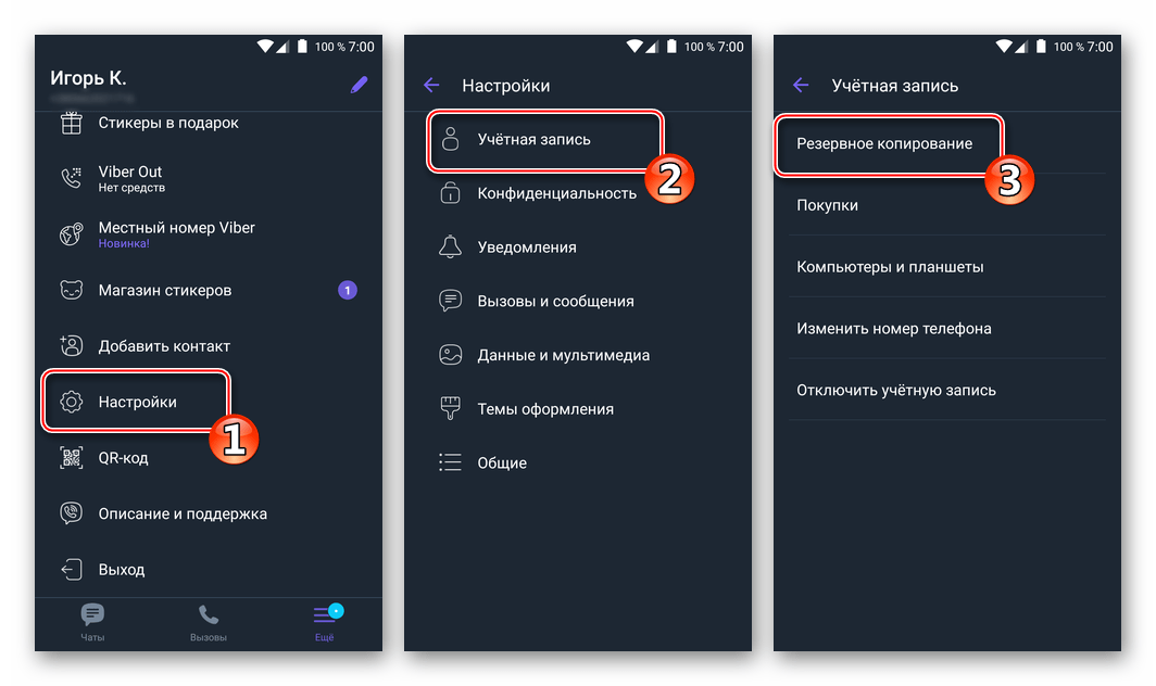 В первую очередь нужно настроить резервное копирование в Вайбере. Все действия выполняются в следующем порядке: