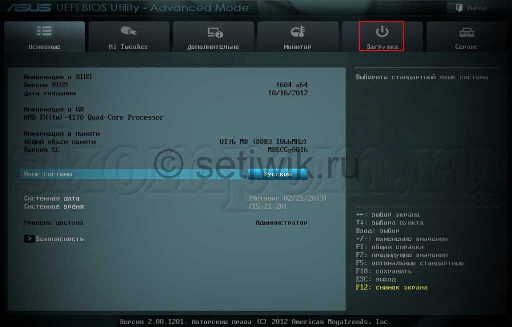 Появится окно расширенного режима UEFI BIOS, в котором Вам необходимо выбрать пункт меню «Загрузка», как показано на картинке ниже.