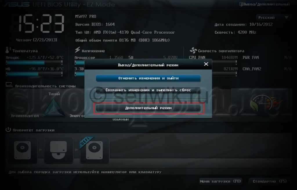 Главное окно UEFI BIOS выглядит так, как указано ниже на картинке. В правом верхнем углу окна можно установить язык интерфейса – у меня выбран «русский». Левой клавишей мыши один раз нажмите на кнопку Выход/Дополнительный.