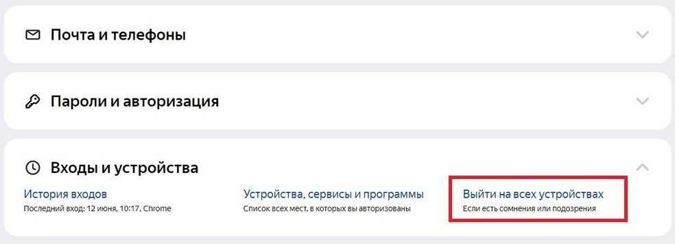 - На новой странице кликаем по строке «Входы и устройства».В выпадающем списке нажимаем на ссылку «Выйти на всех устройствах».