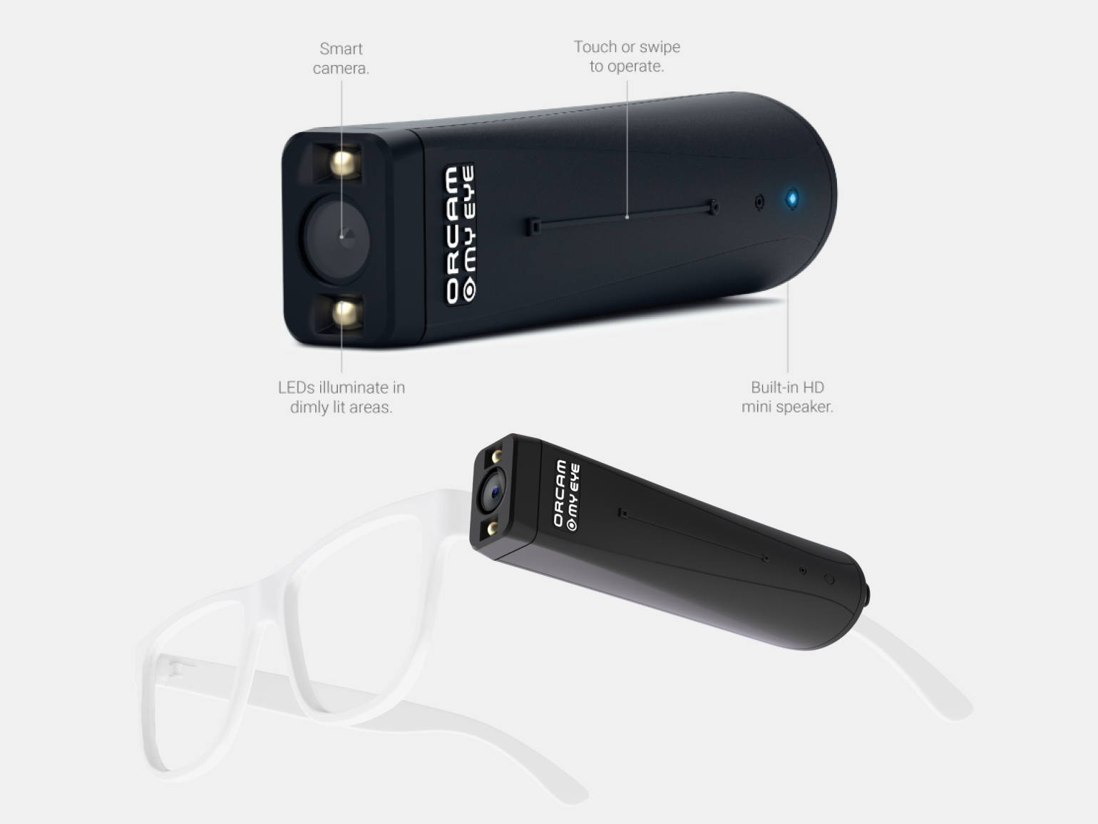 Другой гаджет под названием OrCam MyEye выполнен в компактном и лёгком корпусе, напоминающем по форме флешку. Его масса — всего 22,5 грамма. Устройство можно закрепить на обычных очках или просто держать в руке. Гаджет оснащён камерой на 13 мегапикселей, имеет встроенные элементы LED-подсветки и миниатюрный динамик.