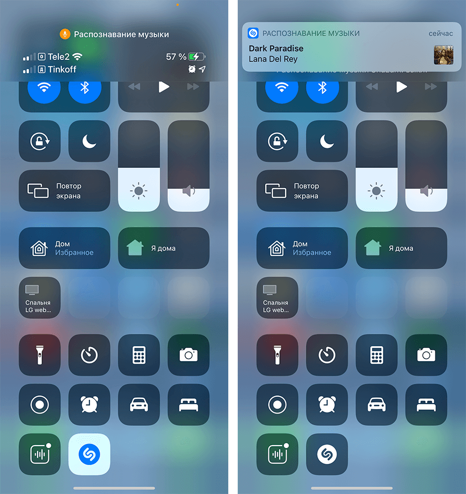 Если вы услышали музыку, автор которой вам неизвестен, нажмите на значок Shazam в пункте управления. Через несколько секунд наверху появится оповещение с названием трека и его автором. Вы сможете перейти в приложение, чтобы сразу послушать песню в Apple Music.