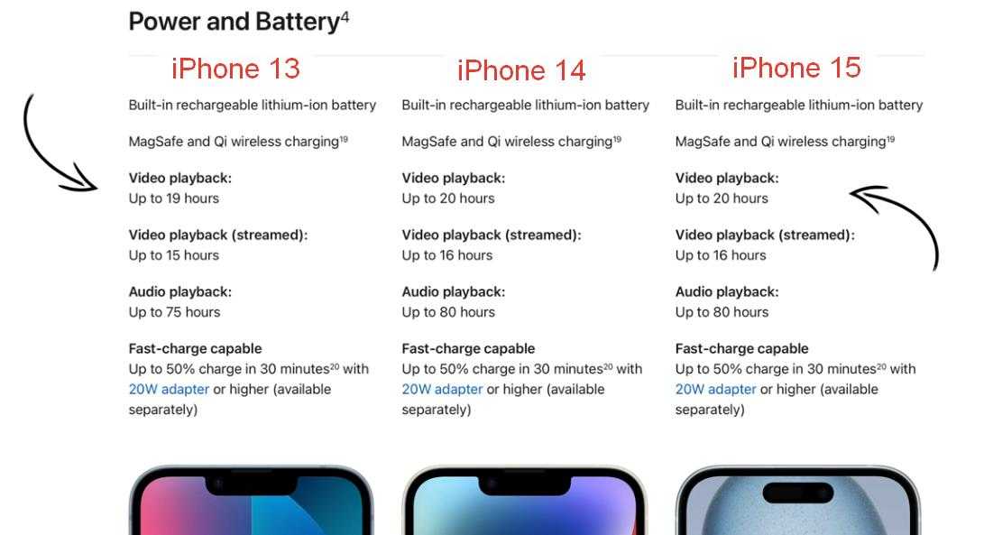 iPhone 13 обеспечивает на час меньше работы в режиме просмотра видео, но это 19 и 20 часов, что как-бы не показатель. А вот в реальной жизни, где есть мессенджеры, социальные сети, YouTube iPhone 13 продержался около 7,5 часов, iPhone 14 чуть больше 8 часов, а iPhone 15 почти 8,5 часов. Что ж в итоге разница примерно тот самый час.