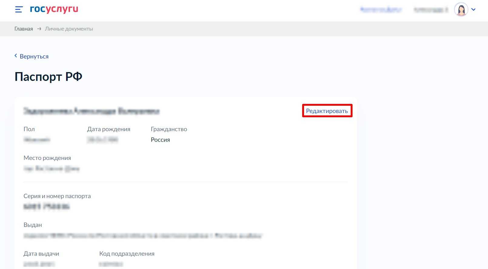 Шаг 3. В разделе паспортных данных нажать на «Редактировать» и вручную исправить информацию. Сохранить обновленные сведения.