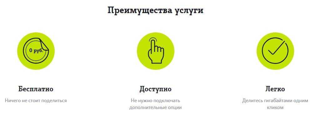 | Услуги сторонних сервисов | Различно | Также существуют сторонние сервисы и приложения, которые позволяют передавать гигабайты между операторами за отдельную плату. |