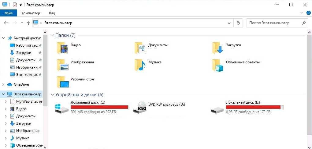 Другой случай нехватки ресурсов компьютера — это отсутствие свободного места на Вашем накопителе, особенно это актуально для системного диска (где установлена Windows). Откройте Проводник, и посмотрите, сколько свободного места на Ваших накопителях. Если диск подсвечен красным цветом, значит у Вас заканчивается место, и его нужно освободить, удалив лишние программы и данные. Особенно недостаток рабочего места негативно сказывается на SSD накопителях — для оптимальной производительности, его объем свободного места должен быть не менее 25% от полного объема.
