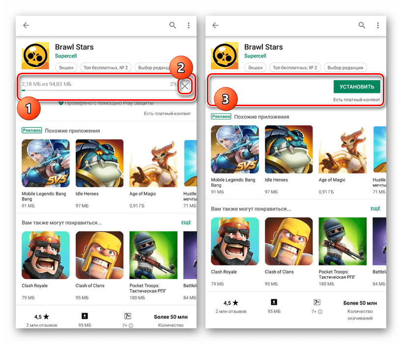 Открыв приложение в Плей Маркете, найдите полосу скачивания и нажмите по значку с изображением крестика. После этого процесс будет сразу же прерван, а добавленные на устройство файлы удалятся. На этом способ можно считать законченным.