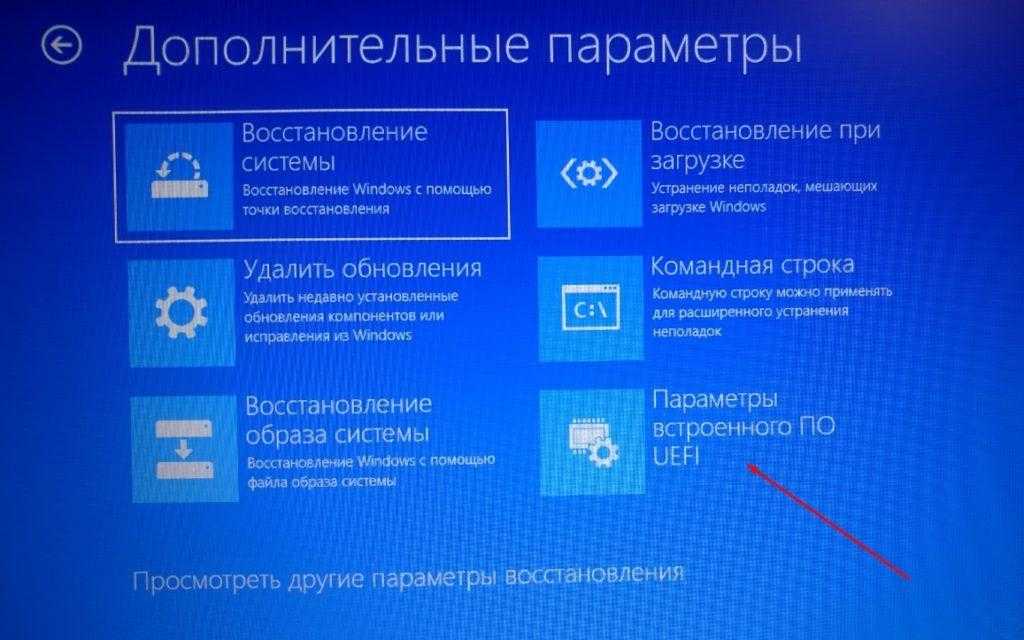 Как только режим запустится, необходимо следовать тому же пути, что был описан выше – выйти в диагностику/поиск и устранение неисправностей – дополнительные настройки – параметры встроенного ПО UEFI и дождаться перезагрузки.
