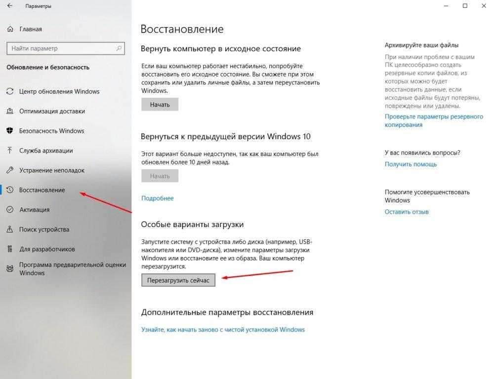 Во вкладке «Восстановление», в самом низу окна, выйдет раздел особых вариантов загрузки. Под ними подразумевается загрузка системы с DVD диска или USB карты, а также изменение некоторых параметров или восстановление из созданного образа. Мне лишь надо нажать на кнопку «Перезагрузить сейчас».