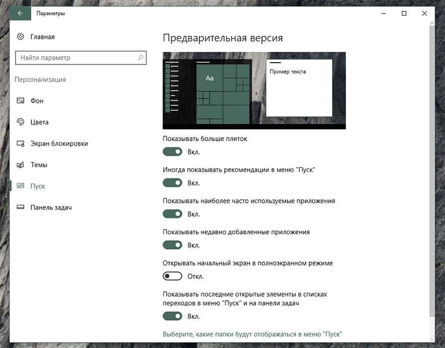 В открывшихся Параметрах перейдите слева на вкладку «Пуск».
