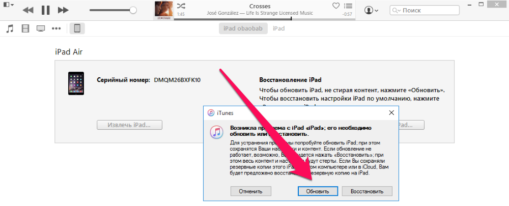 - Отсоедините устройство от компьютера, закройте iTunes и перезагрузите компьютер. Заново подключите iPhone или iPad к компьютеру по USB, запустите iTunes и повторите попытку обновления.