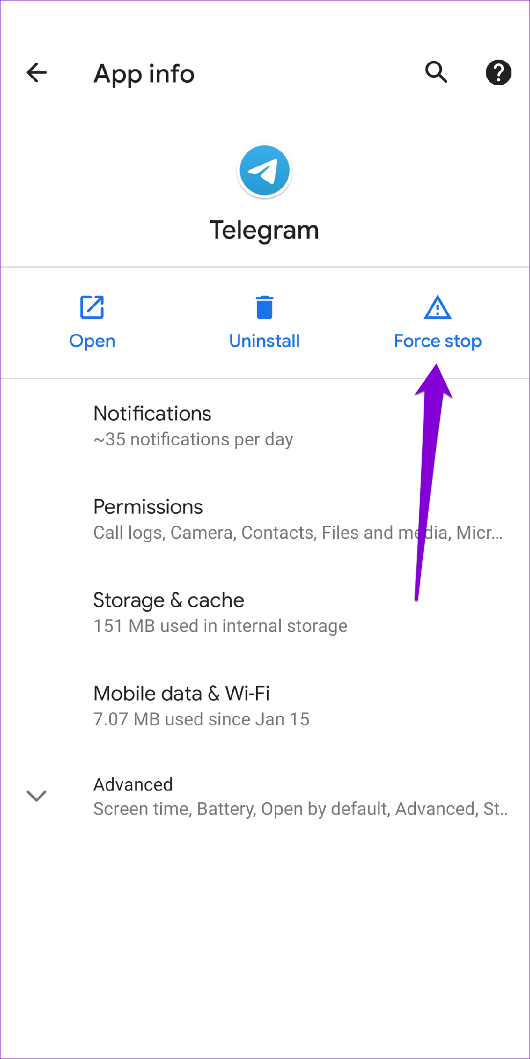 Чтобы принудительно остановить Telegram на Android, нажмите и удерживайте значок приложения Telegram и коснитесь значка информации в появившемся меню. На странице информации о приложении коснитесь параметра «Принудительная остановка».