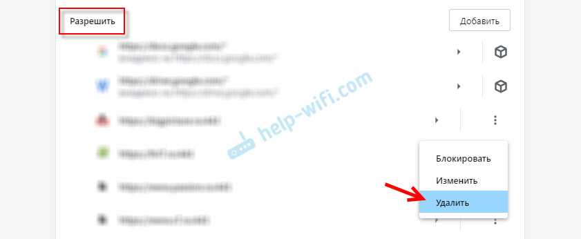 Чтобы удалить все подписки на push-уведомления, просто удалите все сайты из списка «Разрешить». Сайты, напротив которых есть иконка в виде куба, удалить не получится. Они были добавлены туда установленными расширениями.