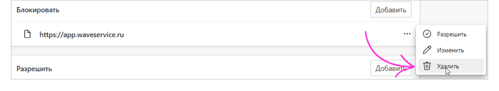 Ниже расположен еще один список с сайтами «Разрешить». Здесь указаны сайты, на которые вы подписаны. Чтобы запретить push-уведомления в Опере, просто откройте меню напротив сайта и удалите его, либо выберите «Блокировать».