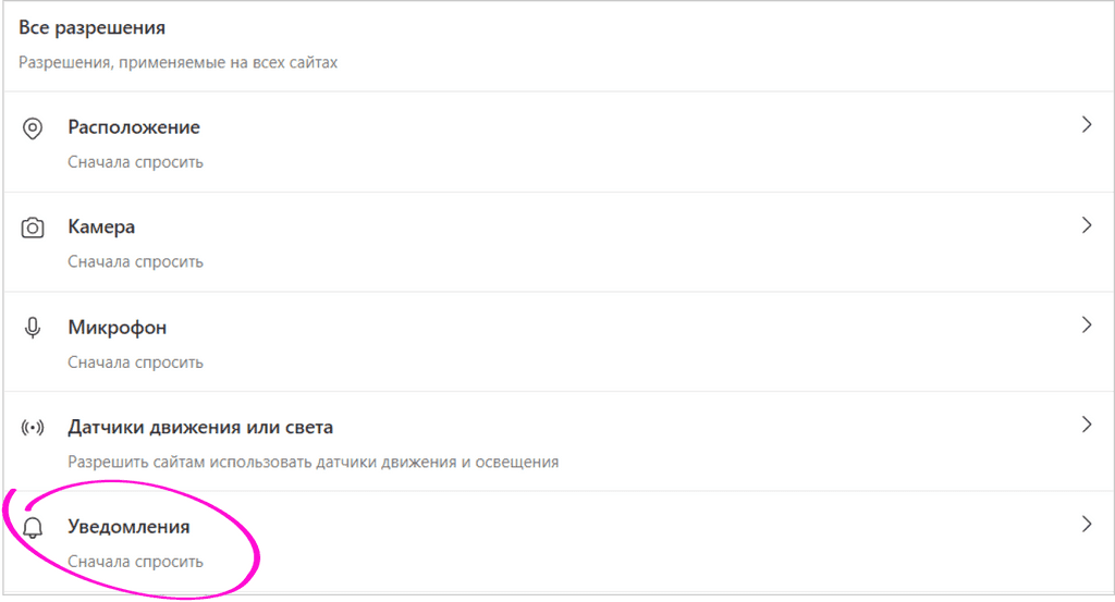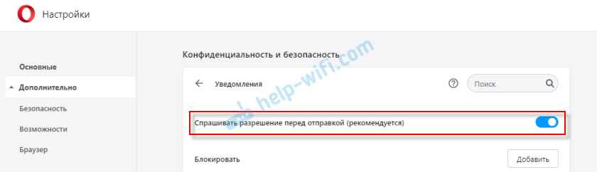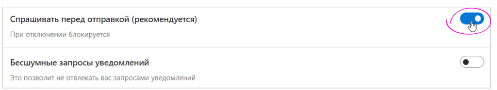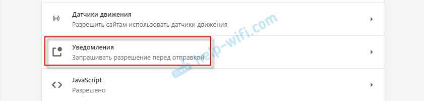 Там в самом верху будет пункт «Спрашивать разрешение перед отправкой». Если он включен, то на сайтах (которые используют пуш-уведомления) будет появляться запрос на отправку уведомлений (как на первом скриншоте в этой статье). Если отключить этот пункт, то подобные запросы появляться не будут, и вы не сможете подписываться на сайты.