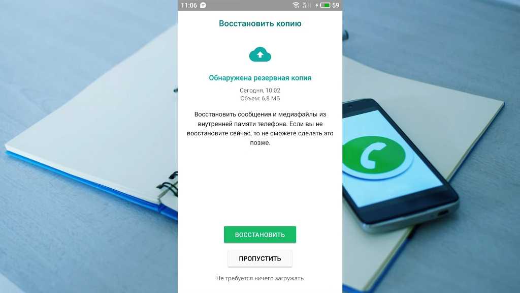 Дождаться окна с уведомлением «Восстановить копию сообщений», кликнуть по кнопке. Клиент должен понимать, что мессенджер автоматически создает резервную копию сообщений даже тогда, когда владелец аккаунта ее не настроил. Происходит это ежедневно в 4 часа утра по местному времени (за этот промежуток времени программа автоматически передает информацию в память устройства на внешний или внутренний накопитель)