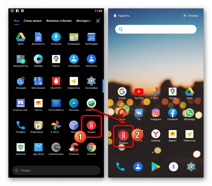Самый простой метод вывода Яндекса на экран смартфона заключается в добавлении значка того или иного приложения данной компании, которое прежде было установлено на устройство. Доступна указанная возможность и на платформе Android, и в iOS, но слегка отличается в плане требуемых действий.