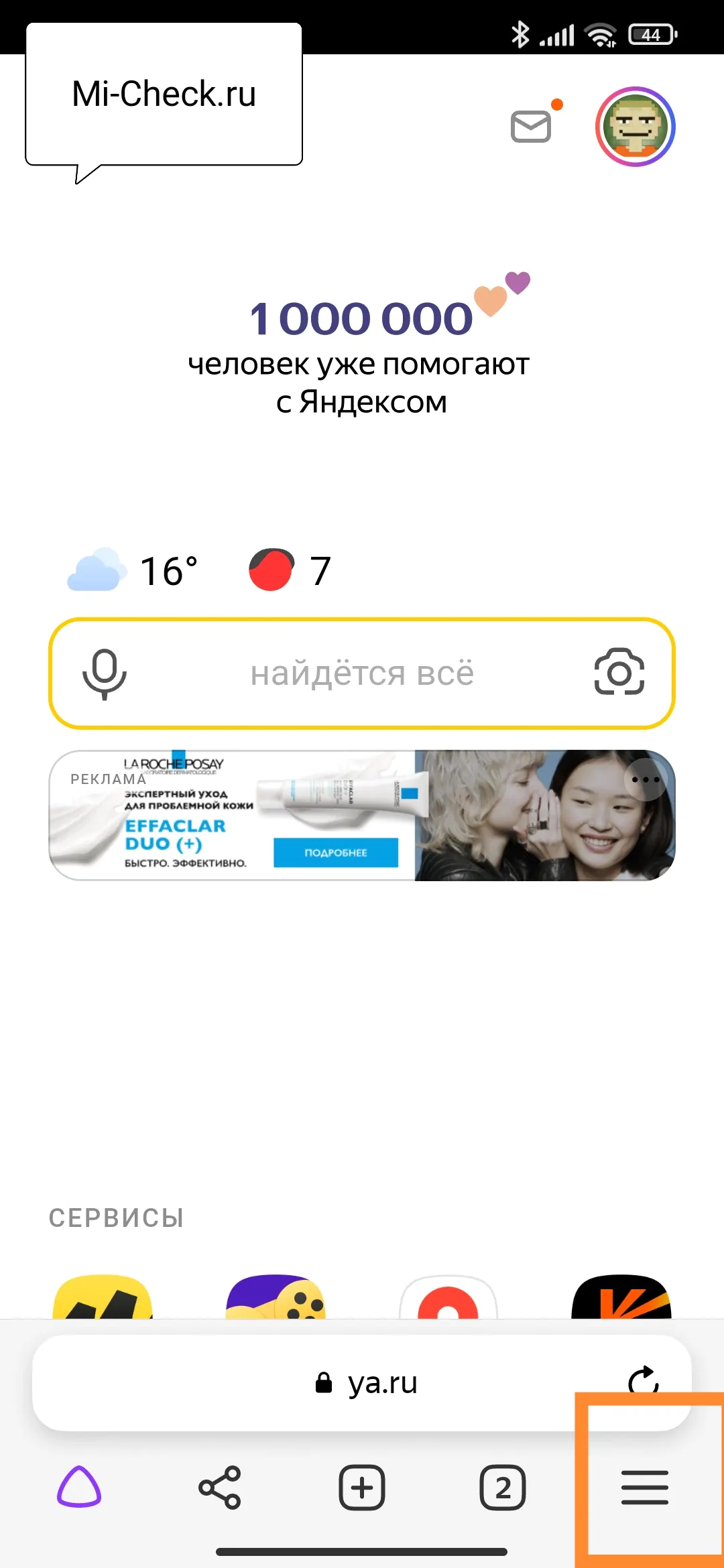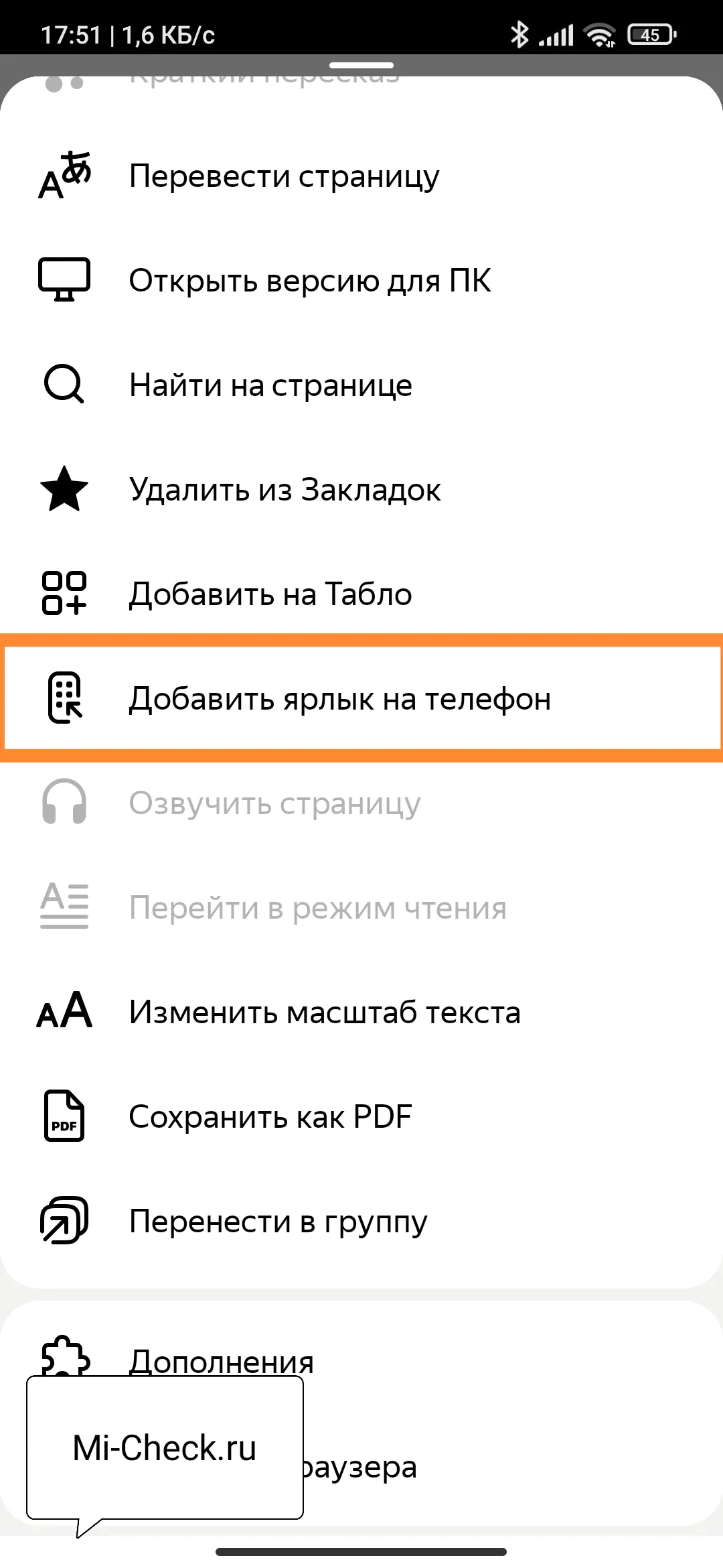 Давайте для примера я покажу, как добавить ярлык для сайта mi-check.ru. Откройте сайт mi-check.ru в браузере от Яндекс, либо главную страницу, либо любую статью. После этого нажмите на иконку «Бутерброд» в правом нижнем углу. Появится контекстно меню связанное с текущим открытым сайтом, пролистайте его вниз, пока не увидите строку «Добавить ярлык на телефон». Нажмите на кнопку, после чего вернитесь на рабочий стол.