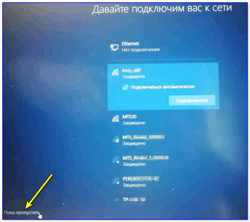 В одном из шагов ОС предложит подключить ноутбук к интернету — временно рекомендую пропустить этот шаг (иначе Windows может начать загрузку обновлений, что отрицательно скажется на времени установки).