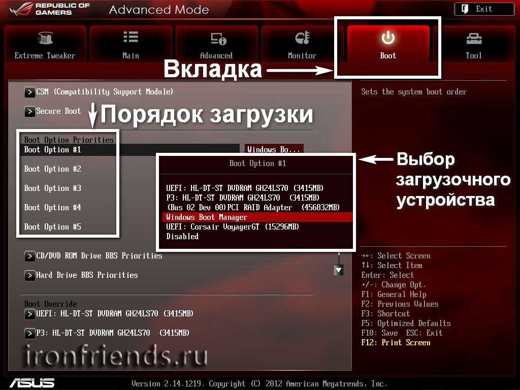 В программе Setup с интерфейсом UEFI все делается аналогично. Ищите раздел «Boot» или «Загрузка», находите там ваш DVD-привод или флешку и поднимаете их в самый верх приоритета загрузки. Плюс для этого можно использовать мышку, что проще и удобнее.