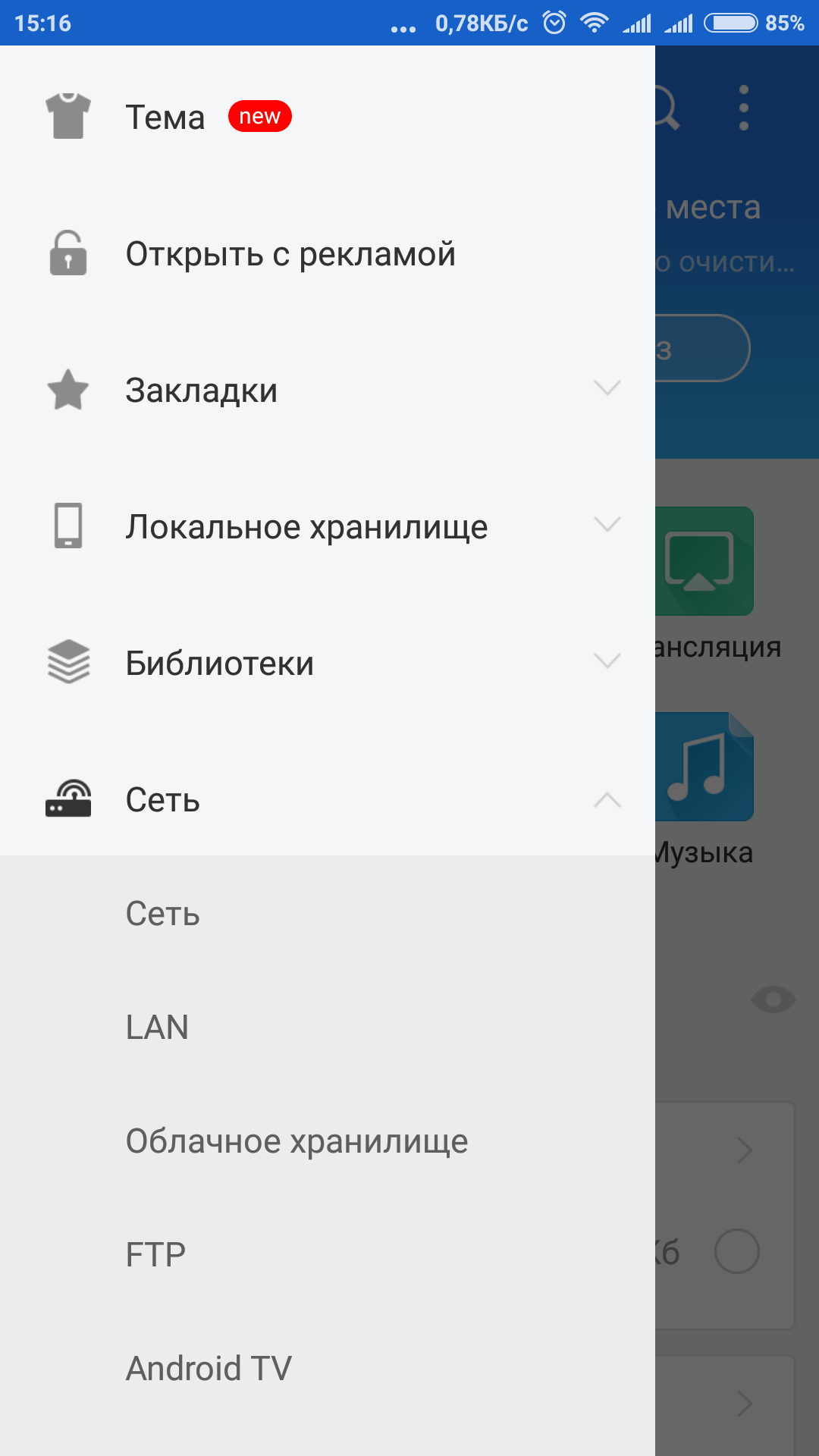 С помощью системных инструментов Android настроить подключение по локальной сети не удастся. Для выполнения необходимой задачи нам потребуется файловый менеджер ES Проводник. Загружаем и запускаем его, в левом боковом меню тапаем «Сеть»-«LAN».
