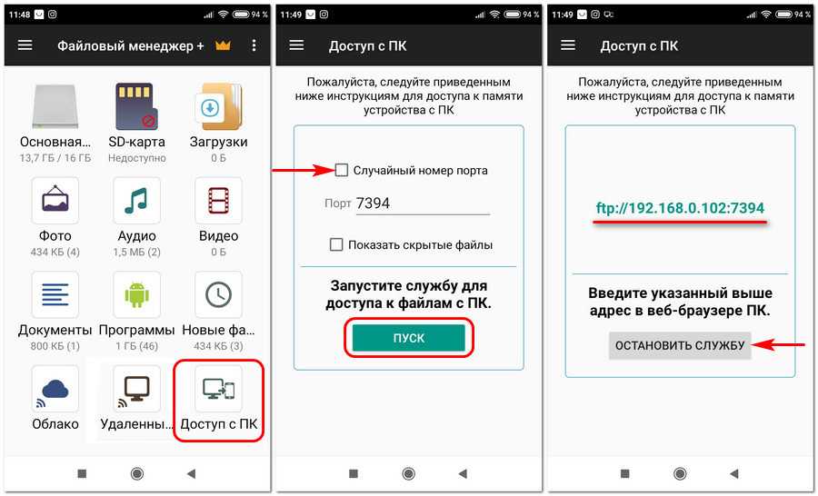 В главном окне приложения «Файловый менеджер +» жмём «Доступ с ПК». В появившейся далее форме снимаем галочку «Случайный номер порта» и жмём «Пуск». Далее увидим FTP—адрес подключения к Android-устройству на компьютере. В этом же окошке подключения будет кнопка остановки работы FTP—сервера – кнопка «Остановить службу». Она, соответственно, отвечает за прекращение сетевого доступа к данным мобильного устройства.