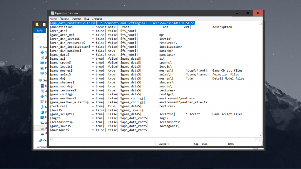 - Открываем в блокноте файл fsgame.ltx, который лежит в папке с игрой. В файле нам необходимо изменить всего одну строчку — $app_data_roots$. Вместо этой строки нужно вписать «$game_data$».