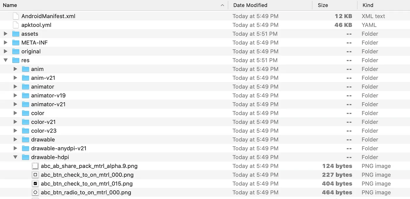 Папка res/ содержит папки с большинством ресурсов XML, например макетов, и изображений, например JPEG или PNG, которые хранятся в своих папках в несжатом виде, в отличие от тех ресурсов, что упакованы в файл resourses.arsc. Папки изображений могут содержать квалификаторы — различные ключевые слова, которые обозначают аспекты и уровни доступа к элементам приложения. Если открыть папку res, внутри можно увидеть папки анимации, цветов и различных изображений: