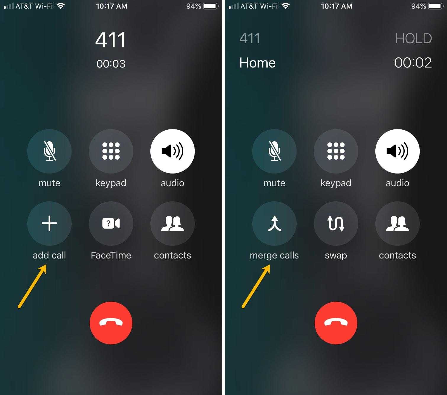 - Третье действие позволяет объединить оба вызова. Это создает конференцию с двумя собеседниками.