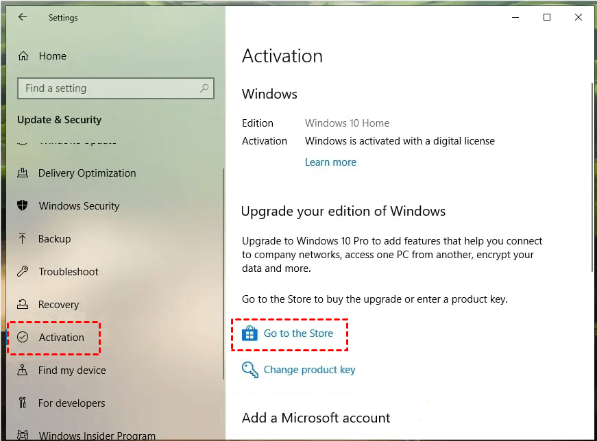 Step 2. Under «Upgrade your edition of Windows», click «Go to the Store».