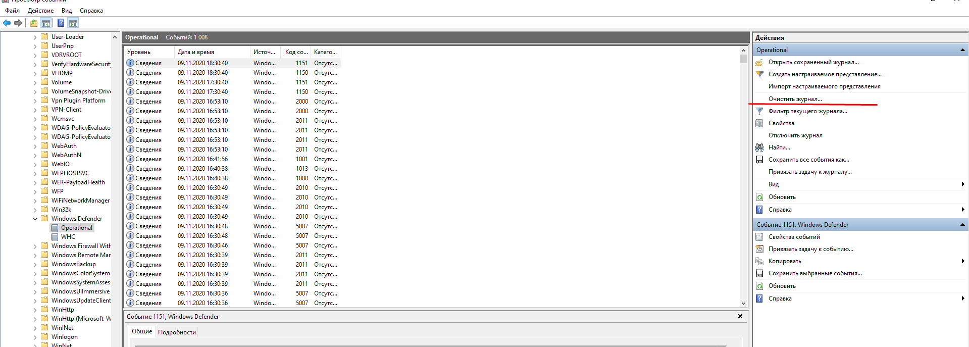 Принудительная очистка Журнала Защитника