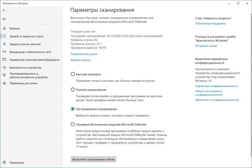 Если вы хотите сканировать только определённую папку или файл, антивирус Windows 10 предоставляет возможность выполнить насраиваемое сканирование.