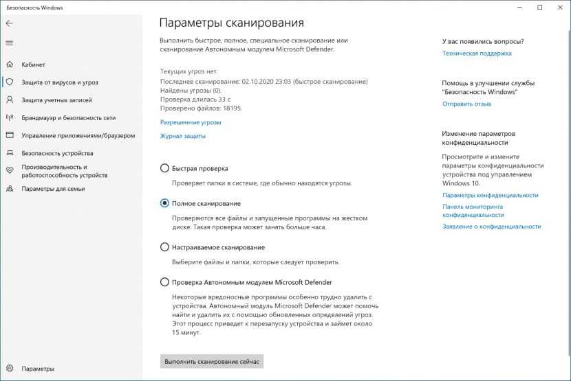 Чтобы запустить полную проверку на вирусы с помощью Microsoft Defender, выполните следующие действия: