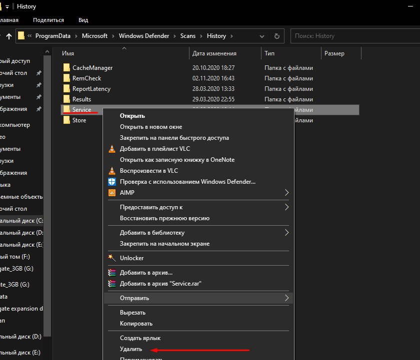 Перейдите в Проводнике в папку C:\ProgramData\Microsoft\Windows Defender\Scans , а затем зайдите в расположенную в ней папку History , подтвердив вход с правами администратора.