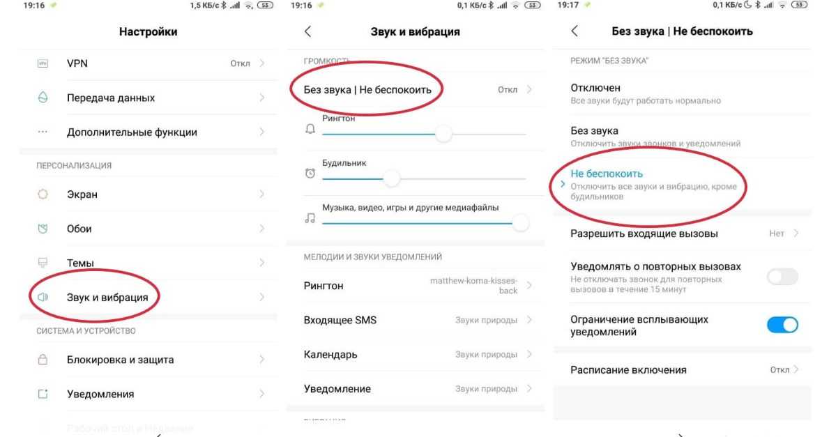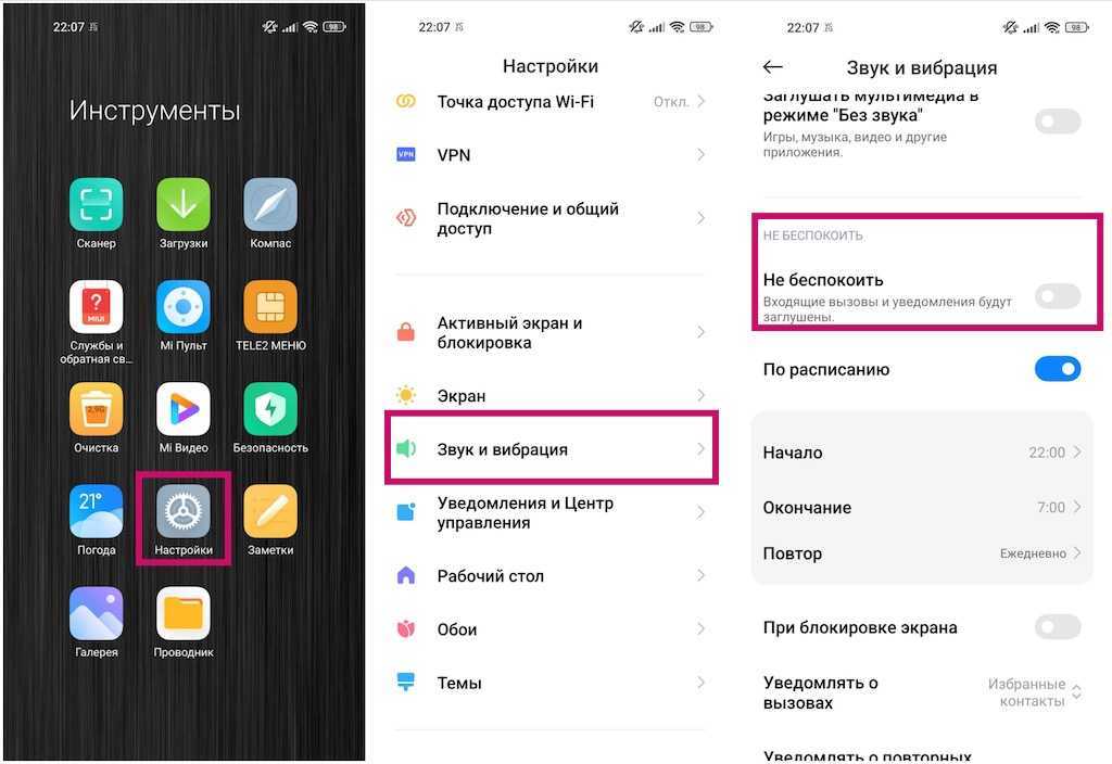 Чтобы настроить данную опцию в оболочке MIUI, потребуется зайти в настройки мобильного устройства, после чего выбрать раздел «Звук и вибрация», открыть подпункт «Не беспокоить/Без звука» и активировать режим, соответственно, «Не беспокоить».