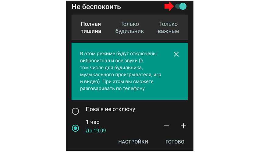 - Нажмите Готово. Будет включен режим «Полная тишина» . Когда он активен: